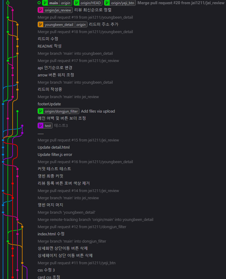 이전 팀 프로젝트에서 깃허브 협업 해 본 경험이 있어 이번에는 크게 헤매지 않고 브랜치 통합을 할 수 있었다.